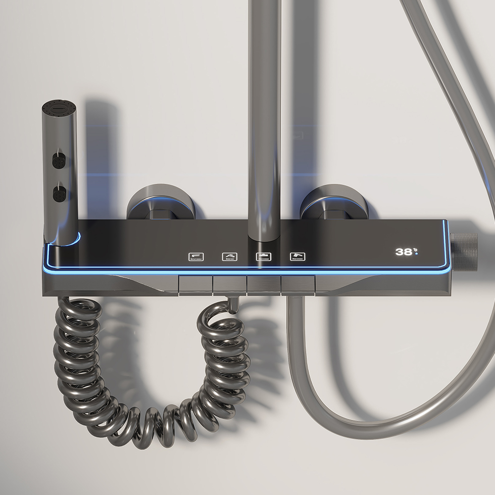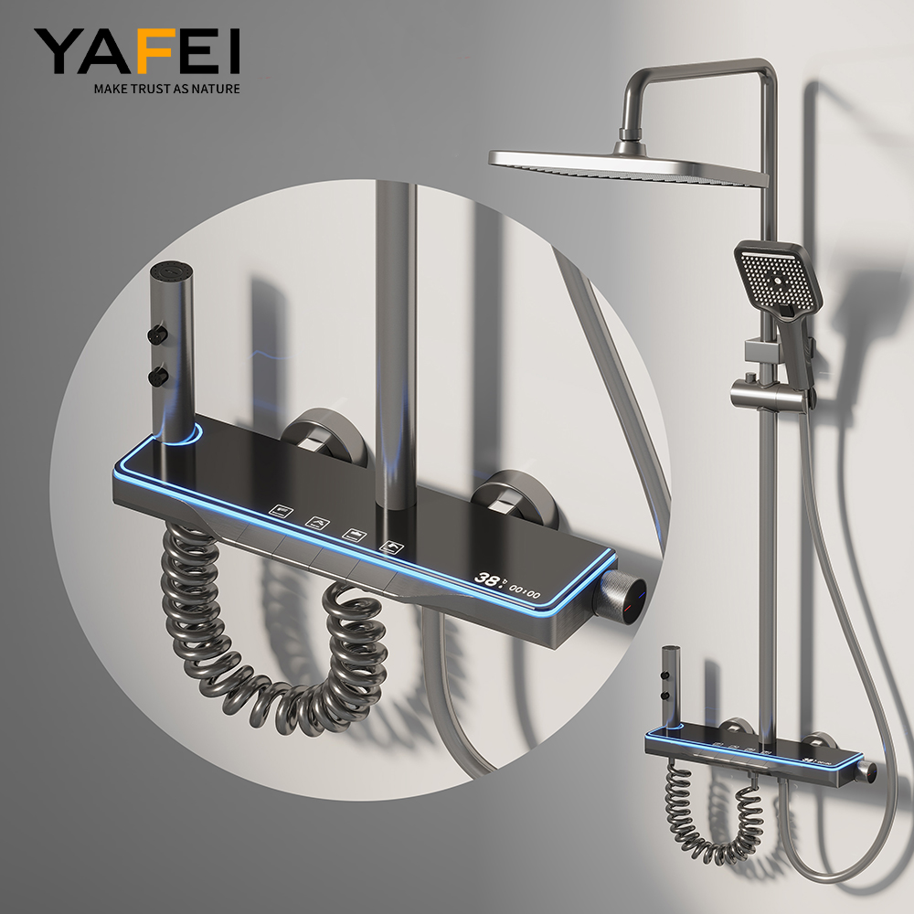Introducing the YF230530044 Gray Thermostatic Shower System—a modern bathroom essential that blends functionality with elegant design. This digital display rain shower combo features LED ambient lights, piano key controls, and 4 versatile spray modes, all housed in a sophisticated gray finish that complements contemporary interiors. Built with lead-free, durable materials, it offers precise temperature control, hydropower efficiency, and humanized adjustments to suit multi-person households. Whether you’re filling a bathtub, cleaning the bathroom, or enjoying a therapeutic massage, this wall-mounted shower faucet set delivers exceptional performance and aesthetic appeal.