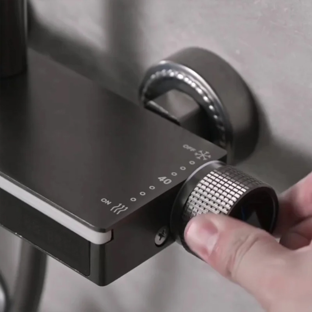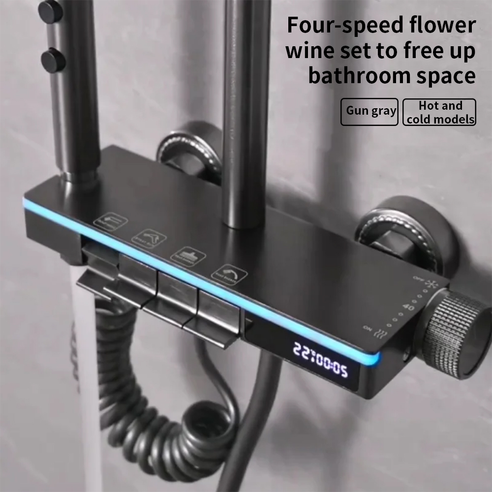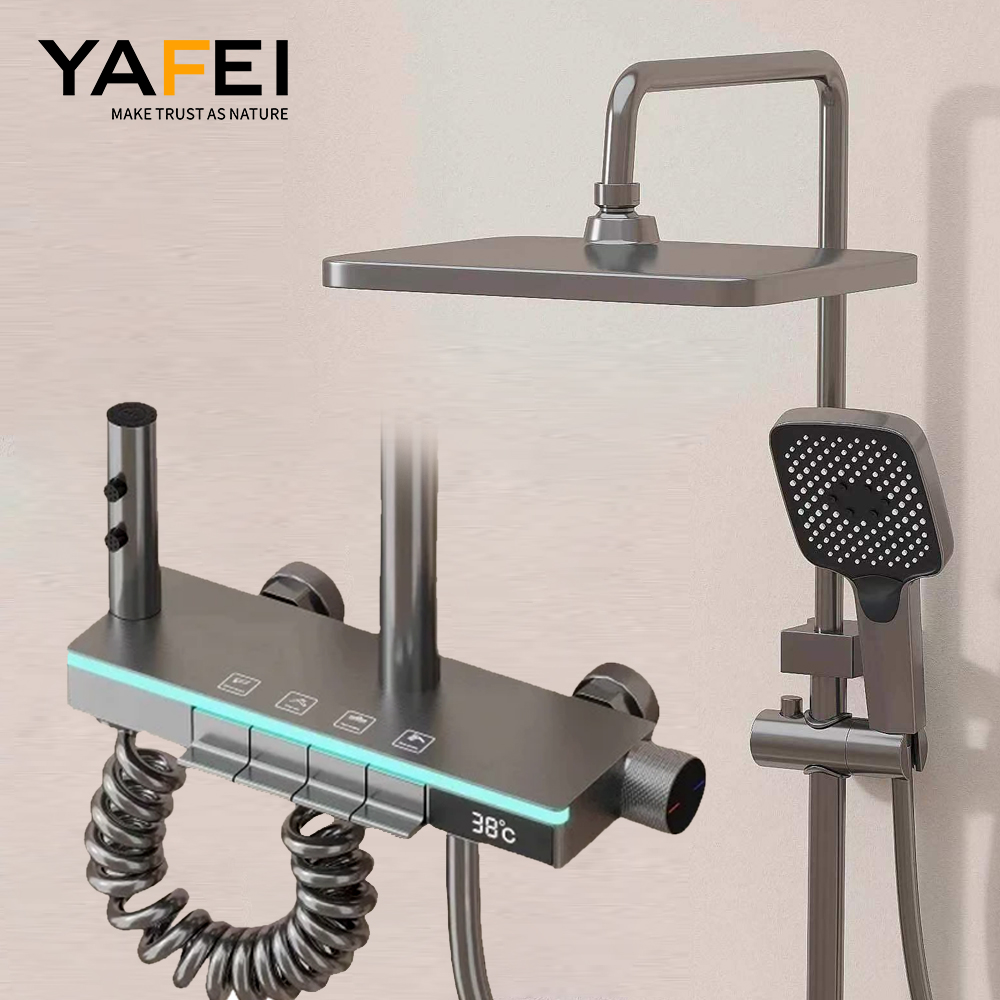 Introducing the YF230530051 Smart Solid Brass Shower System – a high-end, feature-packed fixture designed for modern bathrooms. With 5 independent water outlets, LED digital temperature display, shoulder spray, and an extra-long hose, this system offers unparalleled versatility and convenience. Crafted from premium solid brass and space aluminum, it combines durability, style, and safety, making it a smart investment for families and homeowners seeking a luxury shower experience.