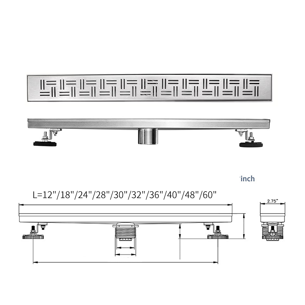 【Modern Bathroom Drain】- 24 inches/2 ft long, 2.75 inches wide, and 2 inches at the center outlet. AISI 304 stainless steel anti-corrosion, anti-scratch and anti-rust, durable. V slope to accelerate water drainge