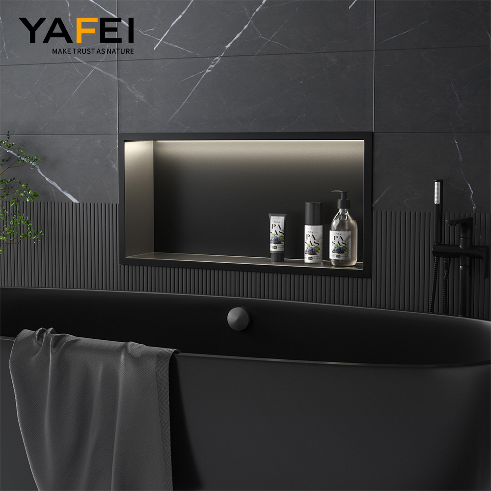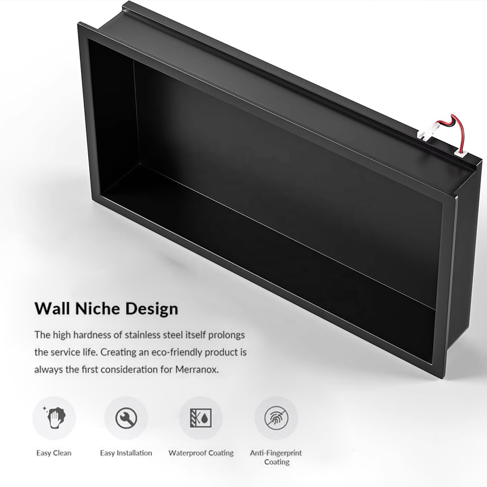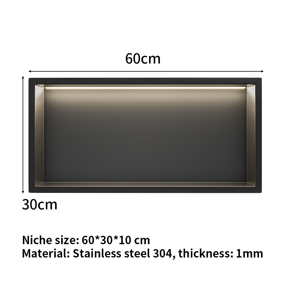 Black LED shower niche. Size: 24"Length X12" Height X4" Depth, 100% leak-free and waterproof. 3000K warm light. The lights on this model with non-dimmableare, but Led light available for dimmer switch.