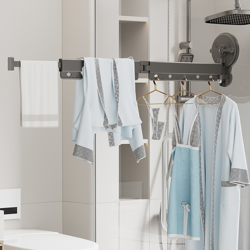 The section of this portable retractable clothes drying rackclose can swing 180 -360 degrees. Retractable laundry drying rack is also equipped with a 25cm telescopic pole, suction cup laundry drying rack can be retracted on the wall when not drying clothes, taking up no space at all.