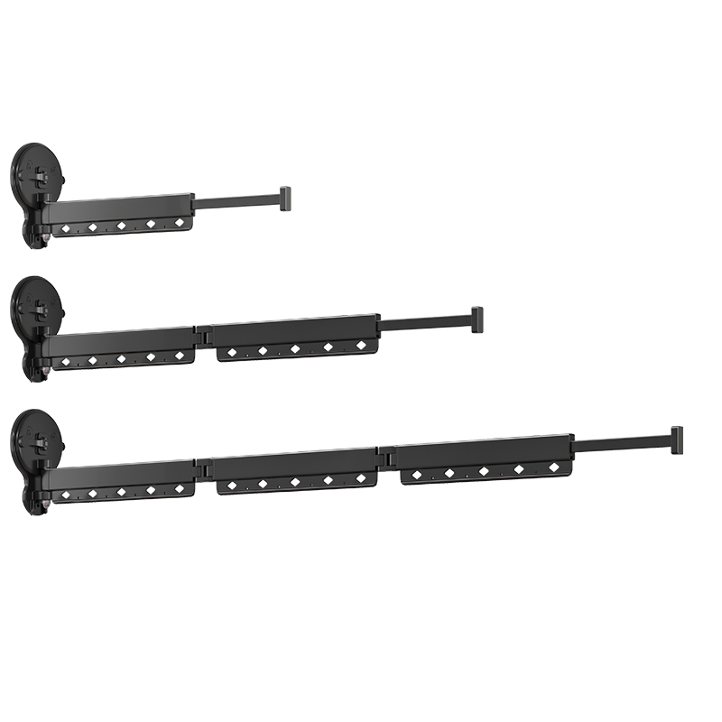 Space Saver: The 2 fold/3 fold design gives this clothes rack the space-saving characteristics. The section of this portable retractable clothes drying rackclose to the suction cup can swing 180 degrees left and right; the other two folding arm and hanger can swing 360 degrees left and right. Retractable laundry drying rack is also equipped with a 25cm telescopic pole, suction cup laundry drying rack can be retracted on the wall when not drying clothes, taking up no space at all.