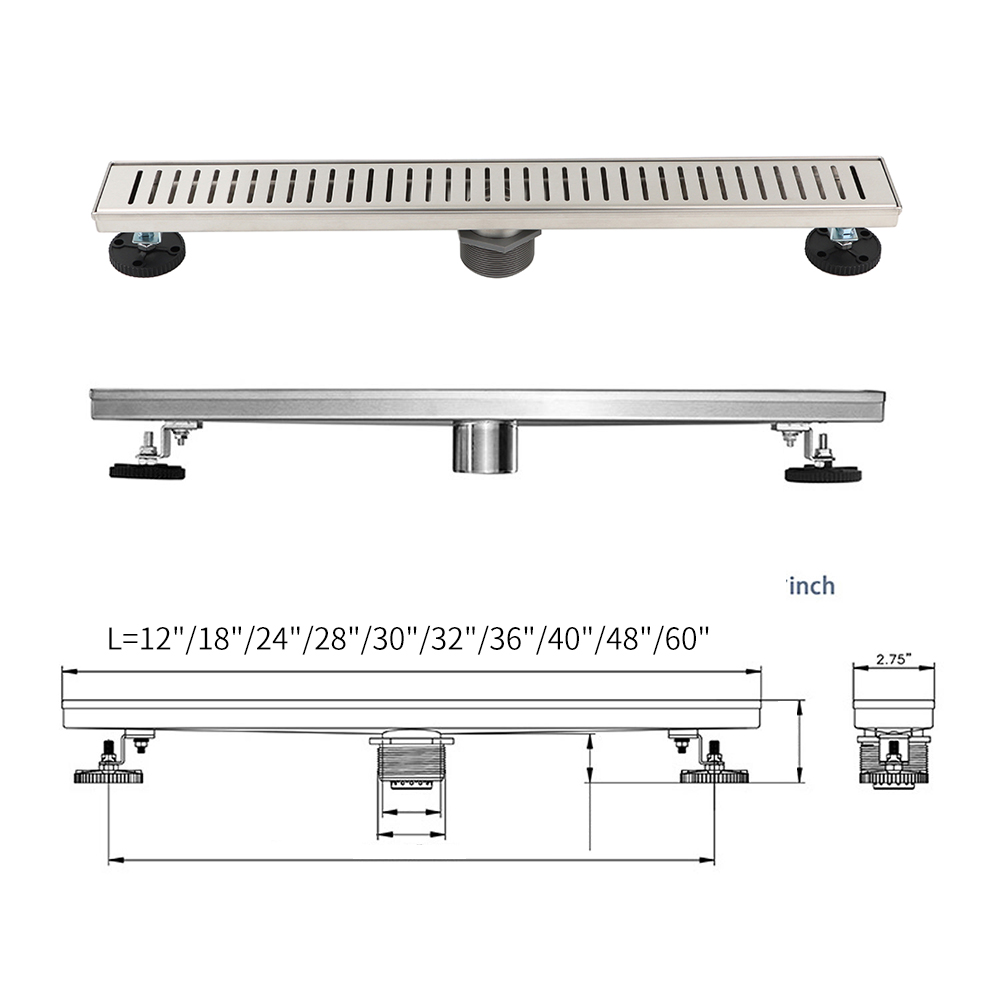 【Сызықтық душ ағызу】 Сызықтық дренаждың өлшемі ұзындығы 24 дюйм және ені 2,75 дюйм. Розетканың диаметрі 2 дюйм. Таяз «V» профилі судың душқа арналған ағызу розеткасына көмектесу үшін. Оны орташа 50,5 л/мин (сүзгі торынсыз) жоғары ығыстыруға қол жеткізуге болады, жақсартылған ішкі еңіс каналда қалған суды іс жүзінде жояды.