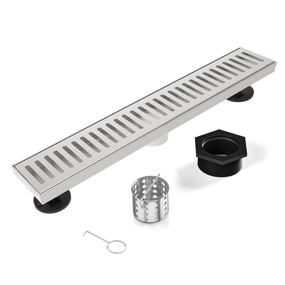 Реттелетін аяқтар орнату кезінде арна корпусын қолдайды, жердің біркелкі болмауынан туындаған орнату мәселесін тиімді шеше алады. Төртбұрышты душ канализациясы жоғары сапалы 304 баспайтын болаттан жасалған.